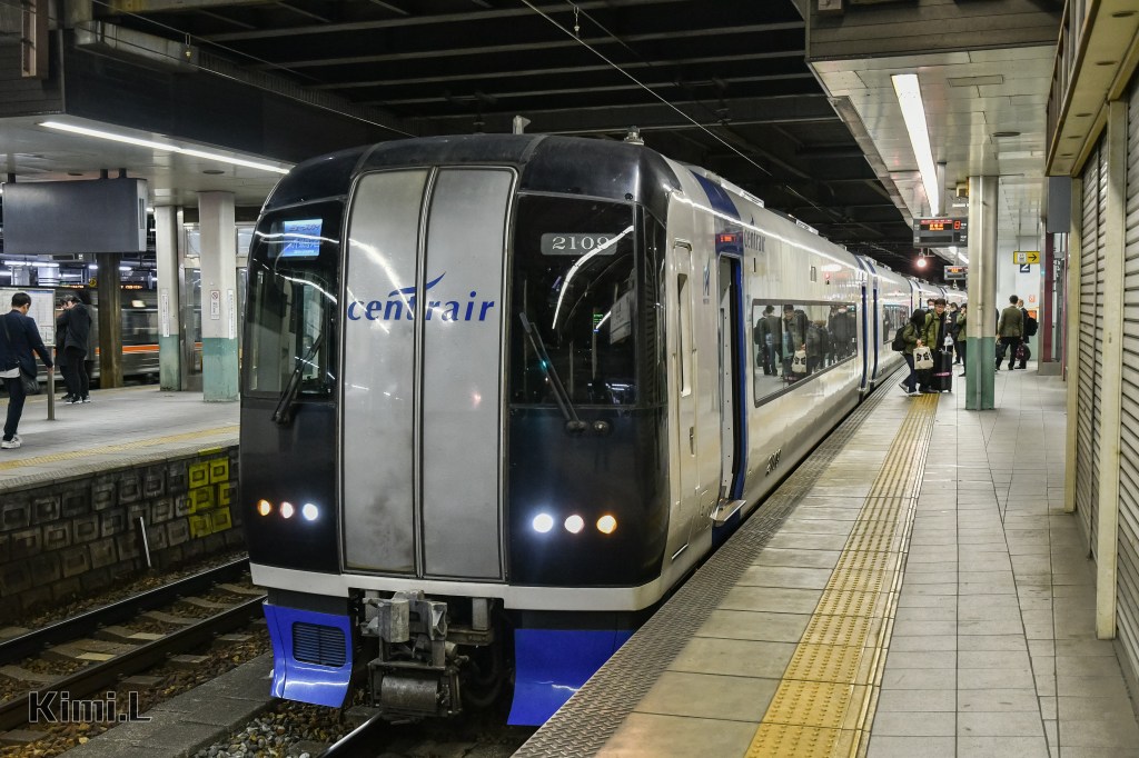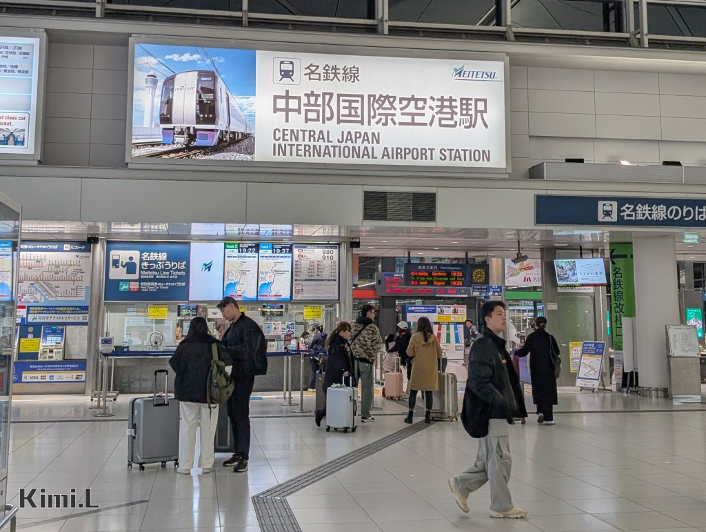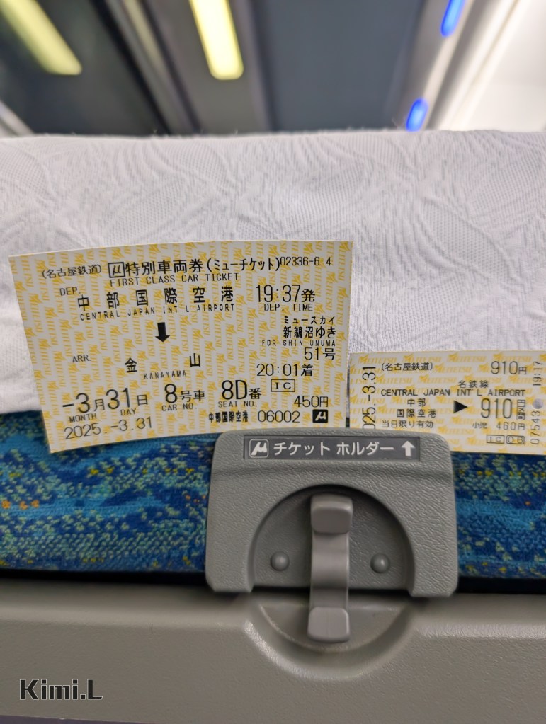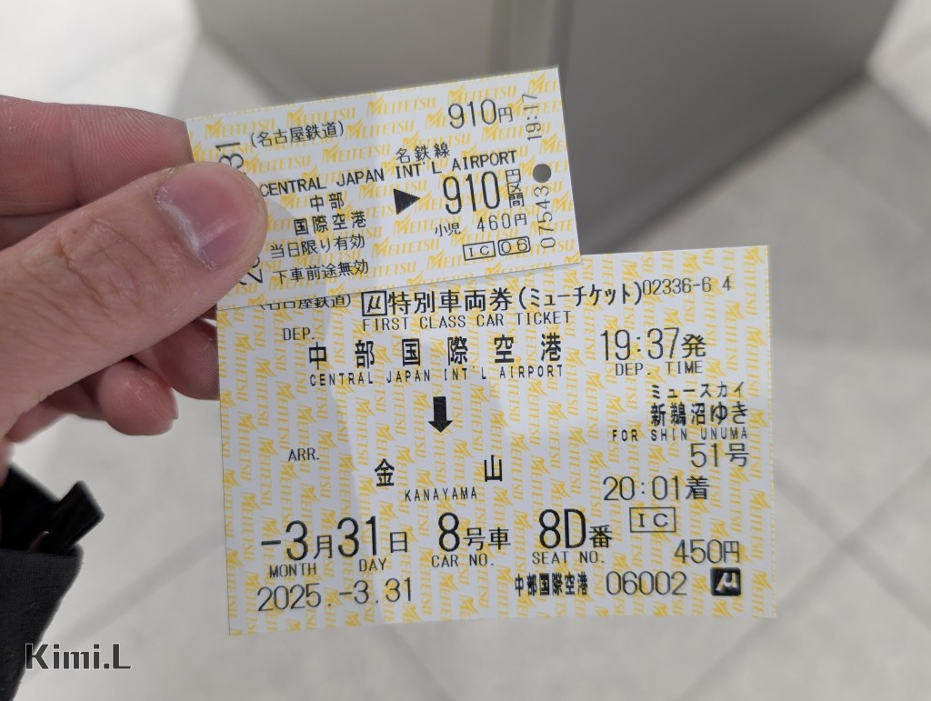 由中部國際機場出發的電車,班次間隔約每小時 6~8 班,若搭乘最快的「ミュースカイ」車種,24 分鐘即可抵達金山站,前往名鐵名古屋也只需要 29 分鐘左右,由於 ミュースカイ 全車 4 節車廂皆為特別車,除了購買乘車券外還必須加購一張 450 円的特別車輛券(ミューチケット, 代表指定座位席),進入驗票口時只需投入小張的乘車券即可。