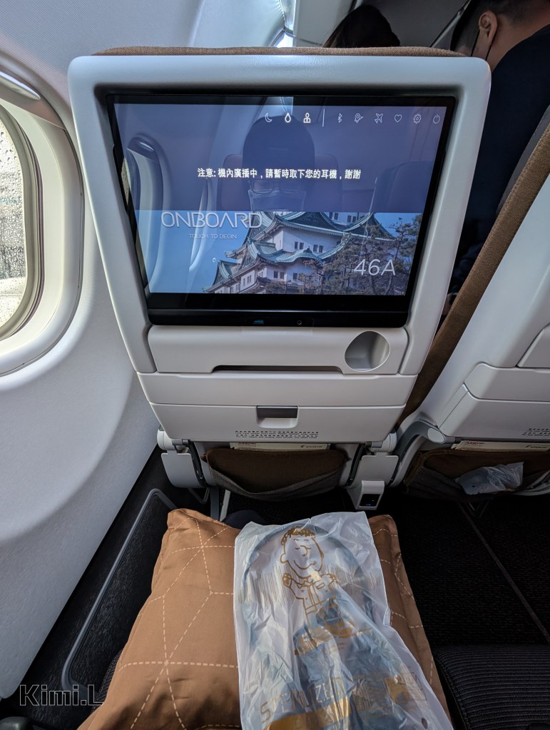 航空公司選擇星宇,主要是衝著相當新的機齡而來,但不知是因應連假龐大的人潮,或是機隊的勤務調整,機型由原先的 AIRBUS A321neo,改為 AIRBUS A330 900neo,經濟艙座位配置由 3-3,改為 2-4-2 的配置,座位空間稍微大了一些,而且還有這個 13.3 吋 4K 解析度的螢幕,然而美中不足的是螢幕反光有些嚴重。