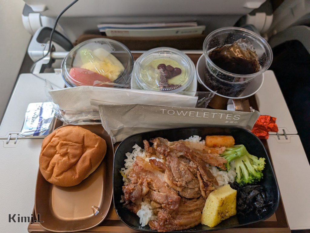 飛機餐食為豬肉飯,口味與份量沒有特別突出,不過從過往到現在所體驗的飛機餐,我最喜歡的就是香噴噴的麵包,再夾進奶油,鹹香鹹香的味道與鬆軟帶點酥脆的口感,總是讓人想再多吃一個。