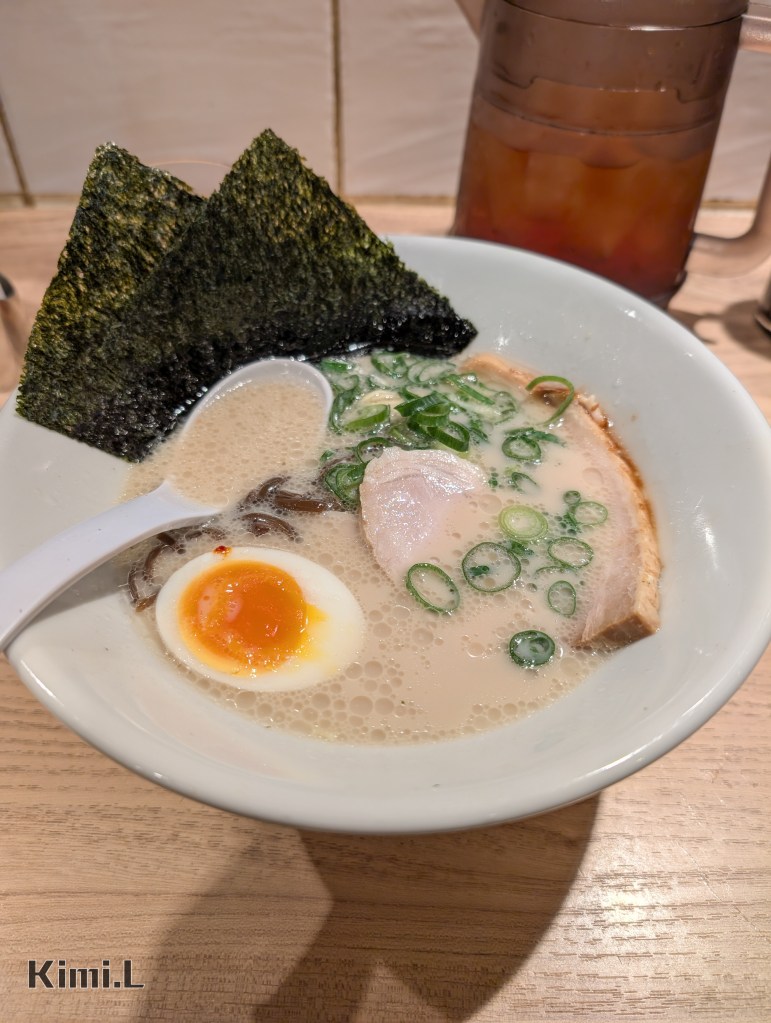 根據 Google 地圖評價,位於入口處的一風堂拉麵擁有較高評價,而且在晚間九點多居然還需要排隊!不過大約 10 分鐘就能入座,點了一碗 極 白丸元味拉麵,擁有濃厚又滑順的豚骨湯底,麵條的口感軟硬適中,帶有些許的嚼勁,也不會過於軟爛,算是在Q與彈之間找到不錯的平衡,叉燒的肥瘦也恰到好處。