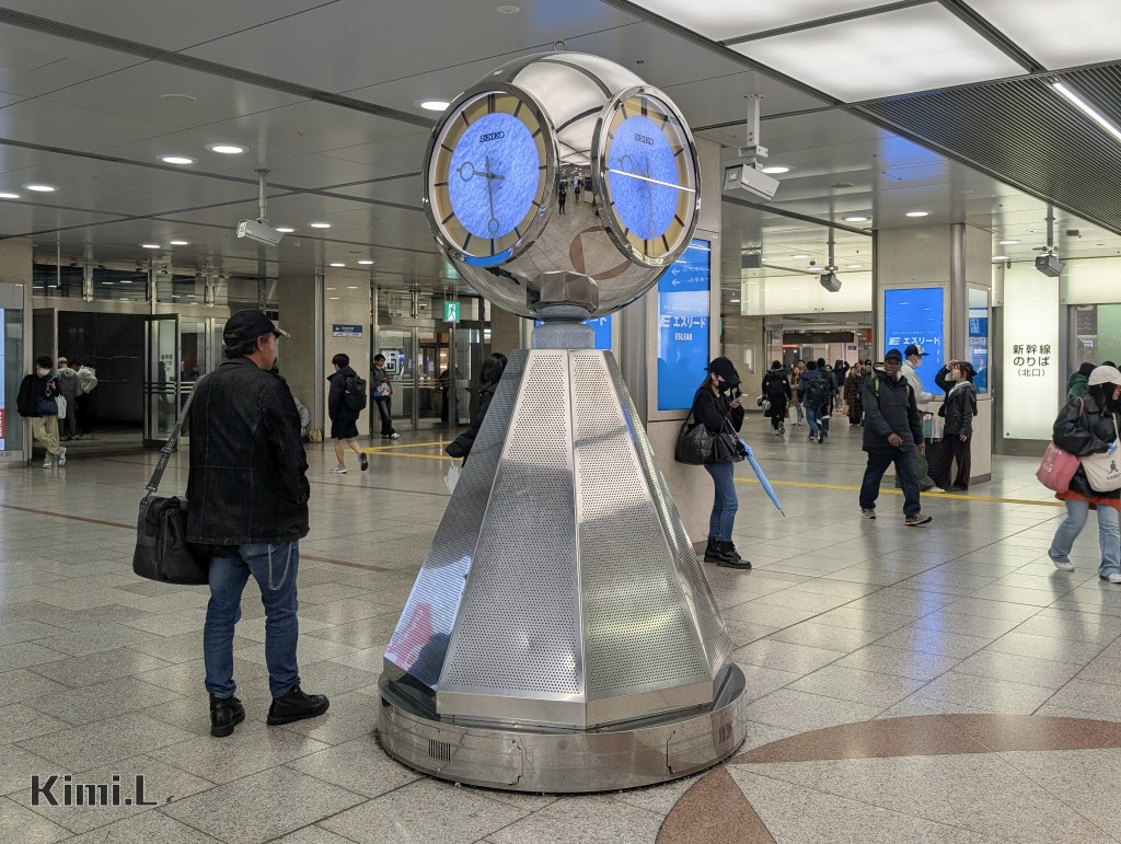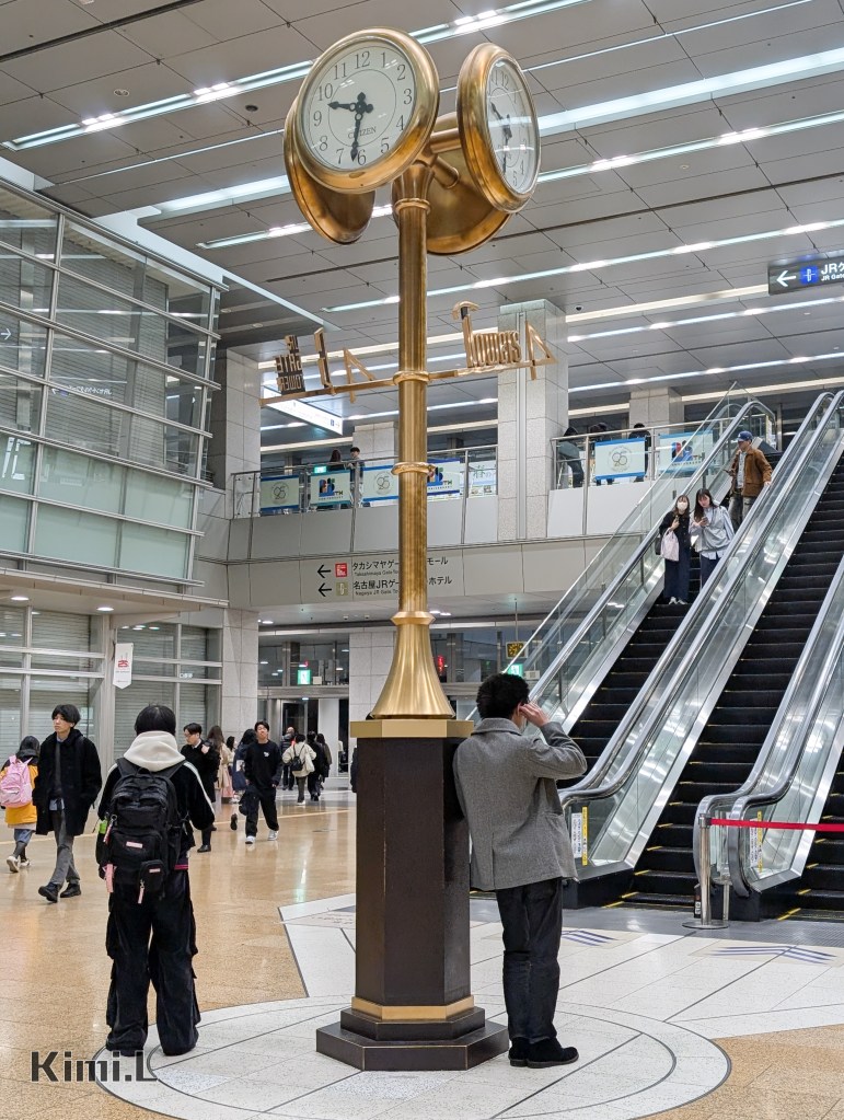 要探索龐大的名古屋車站並不容易,但車站內有幾處知名地標,能快速辨認方位,首先是位於櫻通口的「金時計」,金時計於 2002 年落成,其用意為慶祝名古屋車站的「JR中央塔」落成三週年,其主要特色就是黃澄澄的外觀,以及四個方向都設置了時鐘,讓不同方向的旅客都能輕易看到時間,此處距離百貨 JR 高島屋非常近,搭乘 JR、地下鐵櫻通線也相當方便,因此不少人會將此處作為見面的集合點。