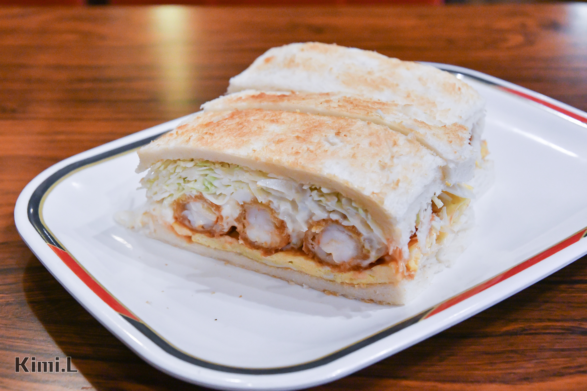 在三明治系列中,最受歡迎的餐點為炸蝦三明治,其最大特色是烤得酥脆吐司夾著三隻完整炸蝦,並加入煎蛋、高麗菜絲與美乃滋,咬下一口便能聽見吐司、高麗菜絲與炸蝦麵衣的清脆聲響,美乃滋與少許的番茄(?)再加上富含水分的高麗菜絲,能緩解吐司與炸物組合下的乾、膩感,整個吐司相當有份量,再搭配一杯抹茶牛奶,可說是滿滿的飽足感。