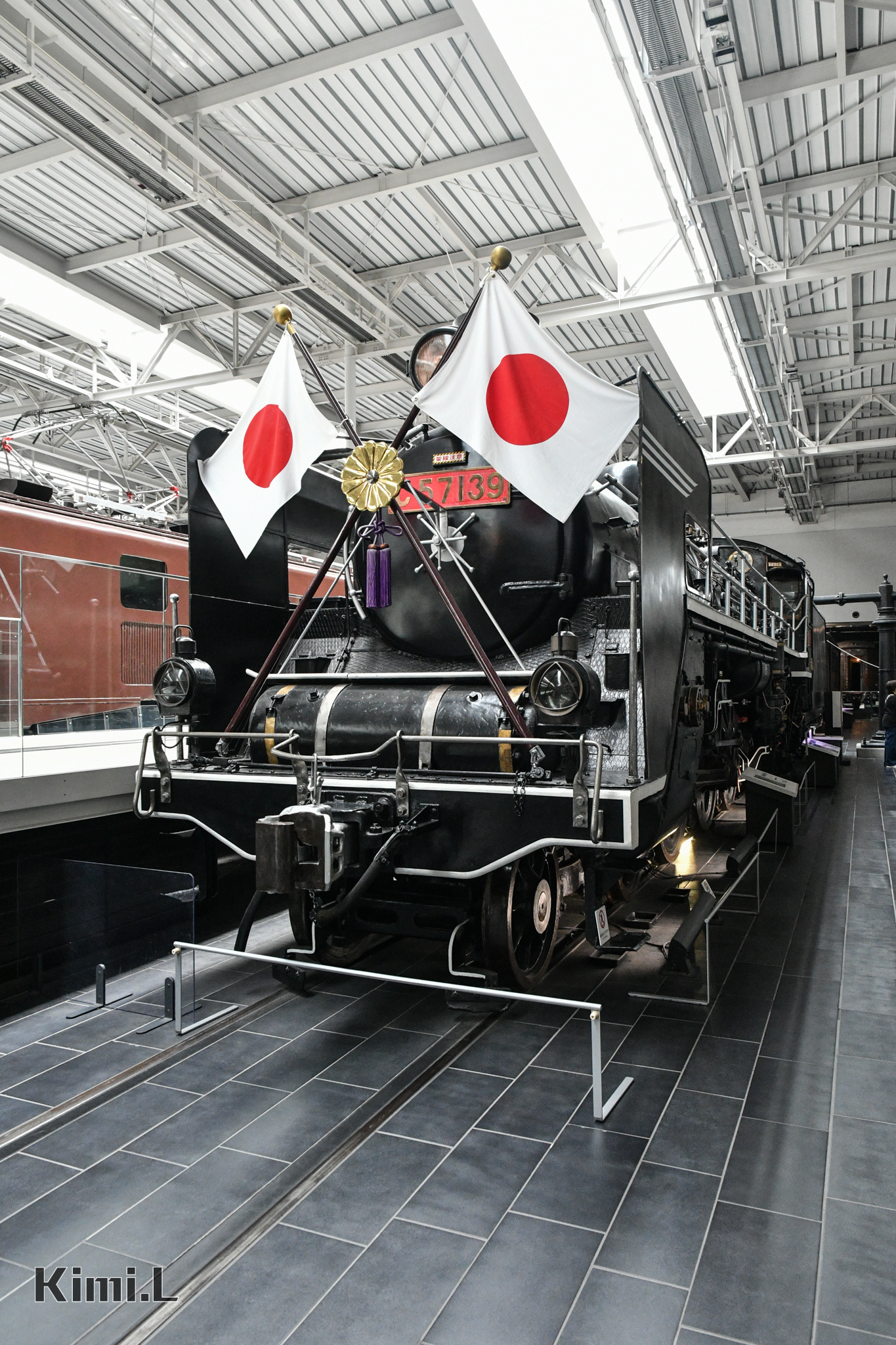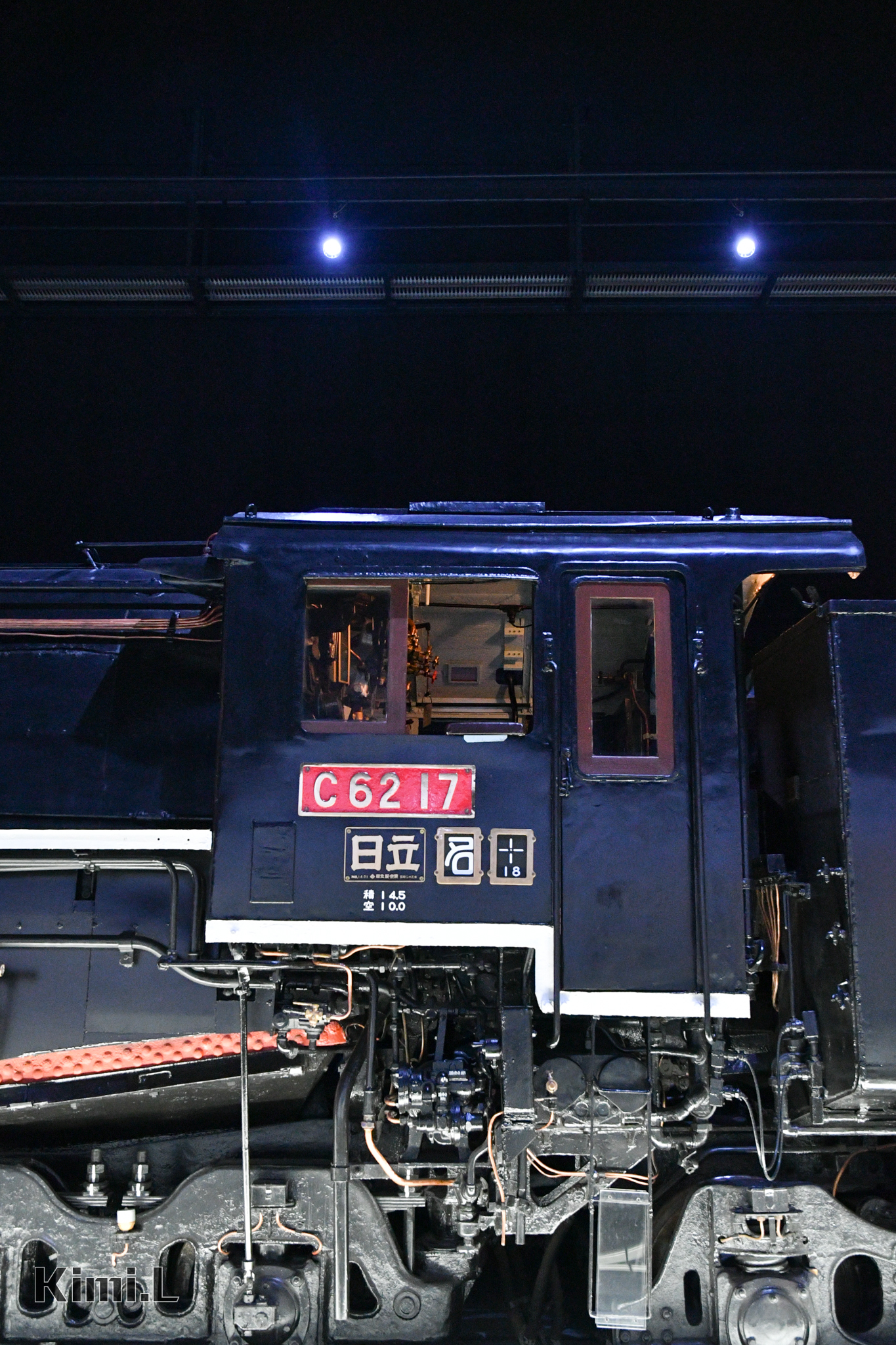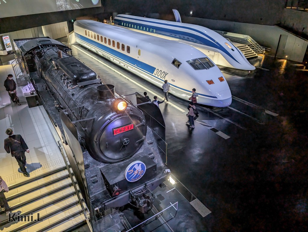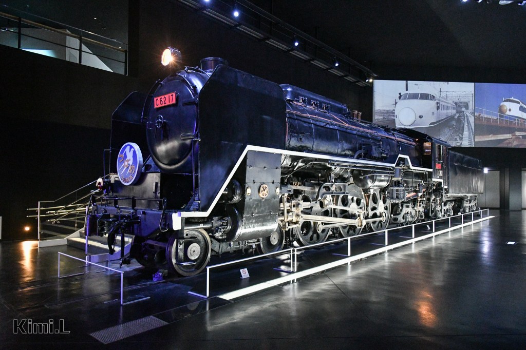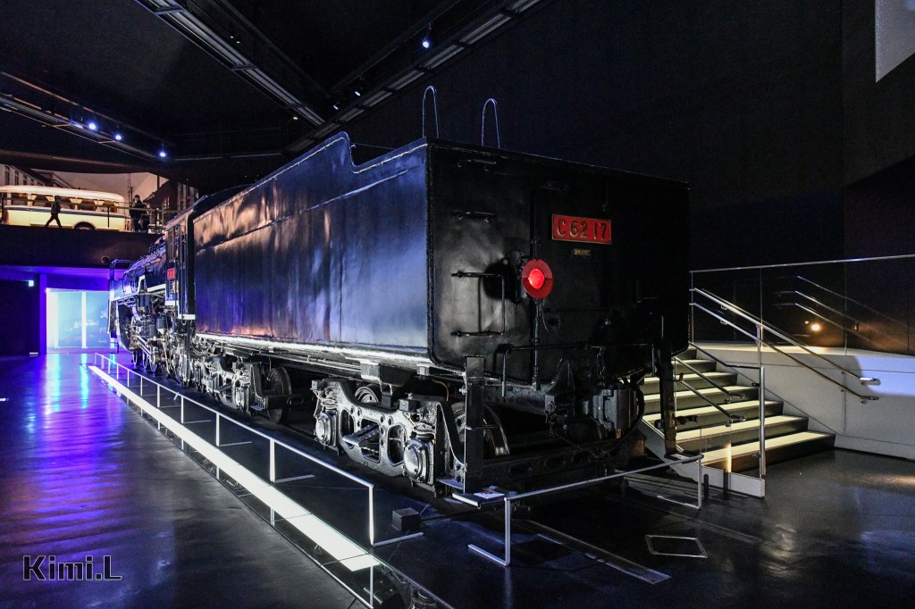 購票完進入展間後,映入眼簾的是一處漆黑帶有神祕感的空間,這裡擺放著三部相當具有代表性的車頭,由左至右分別為 C62 形式蒸汽機關車、955 形新幹線試驗電車以及 MLX01-1 。