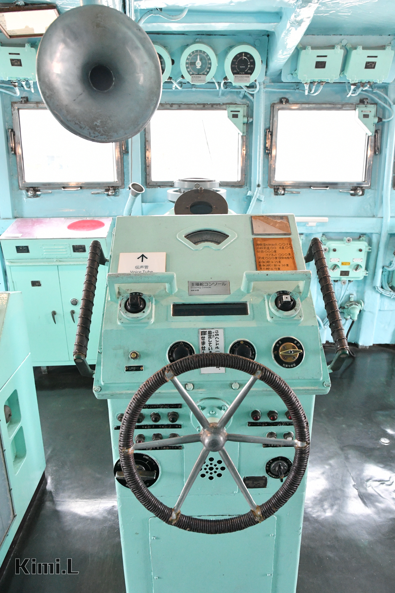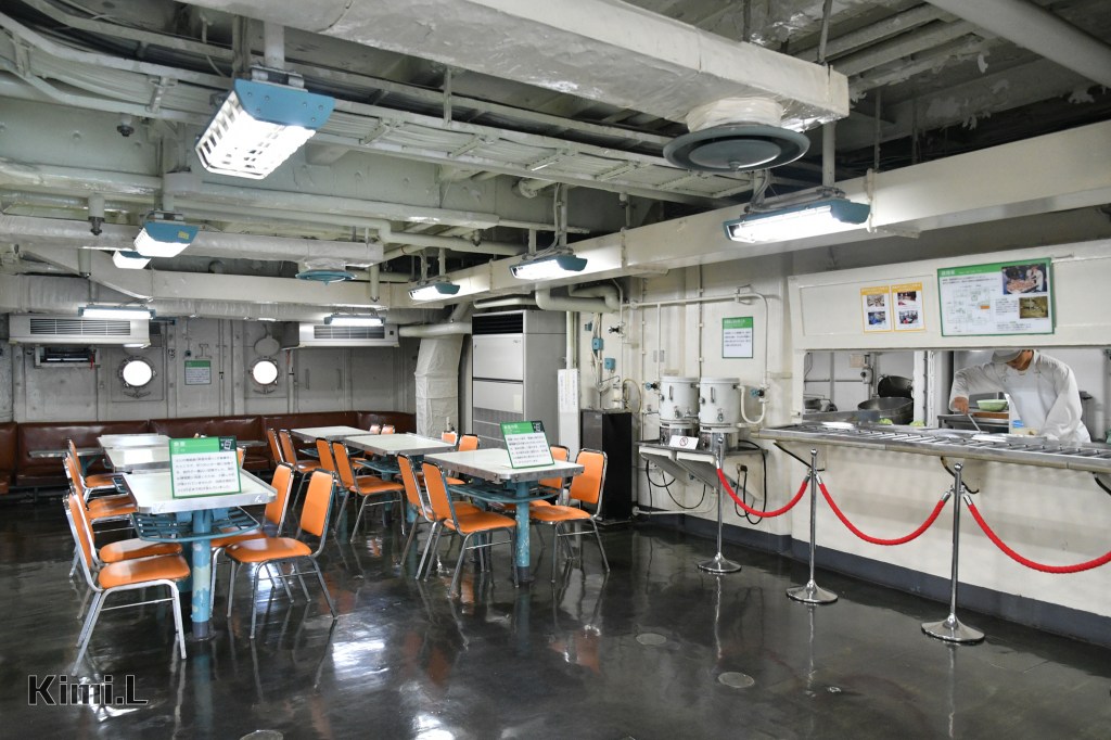 踏入富士號的船身內,映入眼簾的是食堂,此處在過去最多能一次容納 100 人用餐,由於改建成博物館的需求,桌子只保留了六張,由於富士號前往南極的過程中,必須經過南緯 60 度附近的暴風圈,船體會劇烈搖晃,因此桌子都是被牢牢在固定在地上,桌子也被設計成凹槽狀,防止餐具掉落。