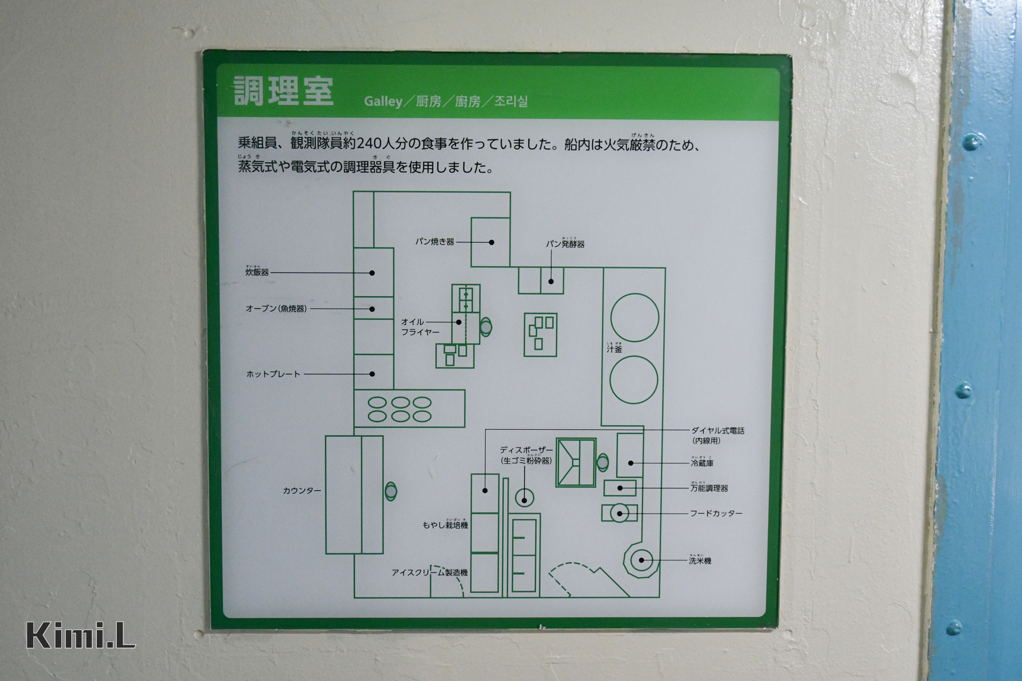 富士號上的設施大多都被保留下來,完整呈現當年在前往南極大陸執行任務的樣貌,為了更加生動,還設置了人物蠟像,眼前看見的是廚房,是讓全船存活下去的關鍵之一,由於船內全面禁止火氣設施,因此廚房內部所有的烹飪器材皆使用蒸氣或電力,最特別的是還配置豆芽菜的栽培設備,以及冰淇淋製造機。
