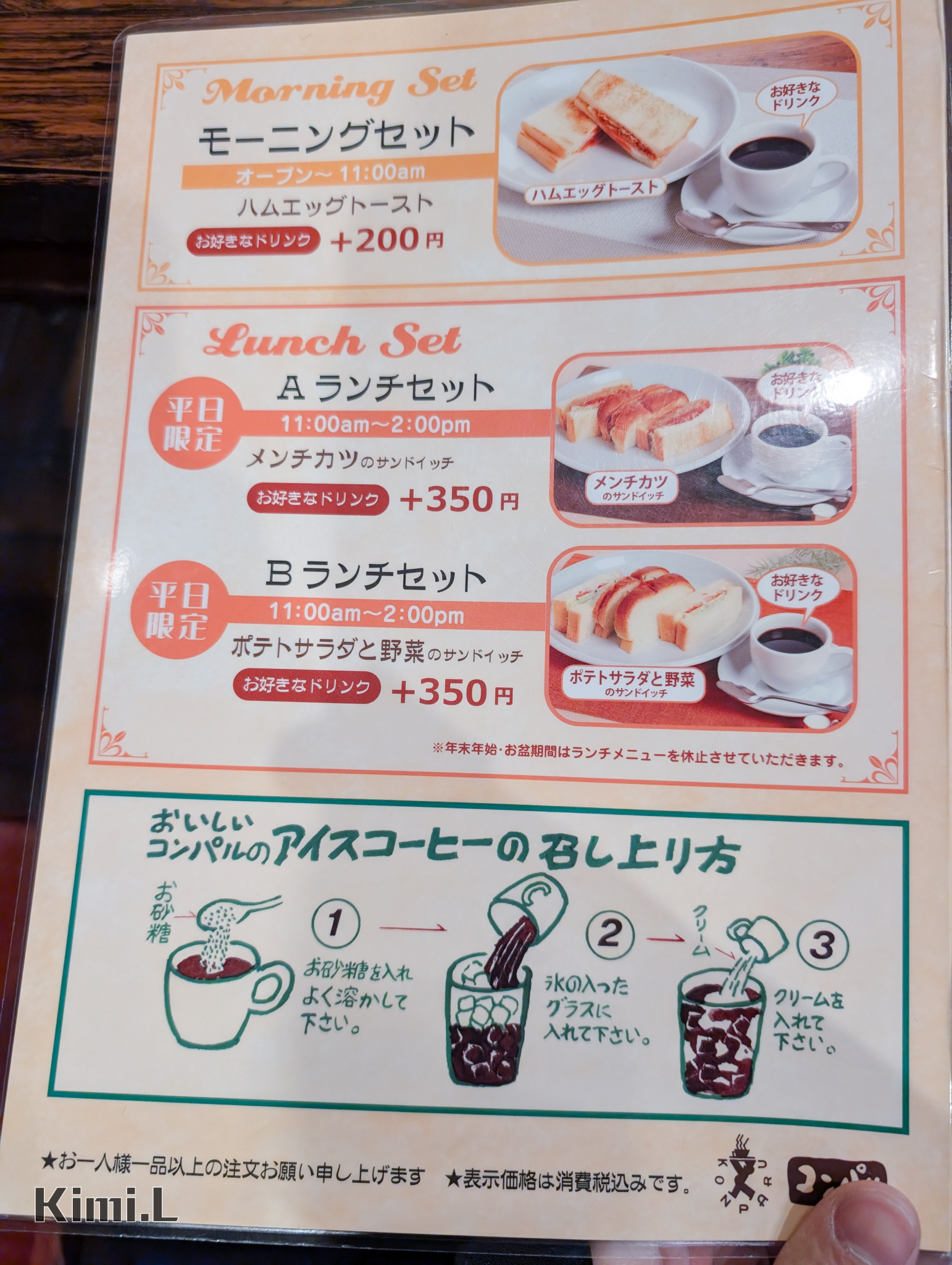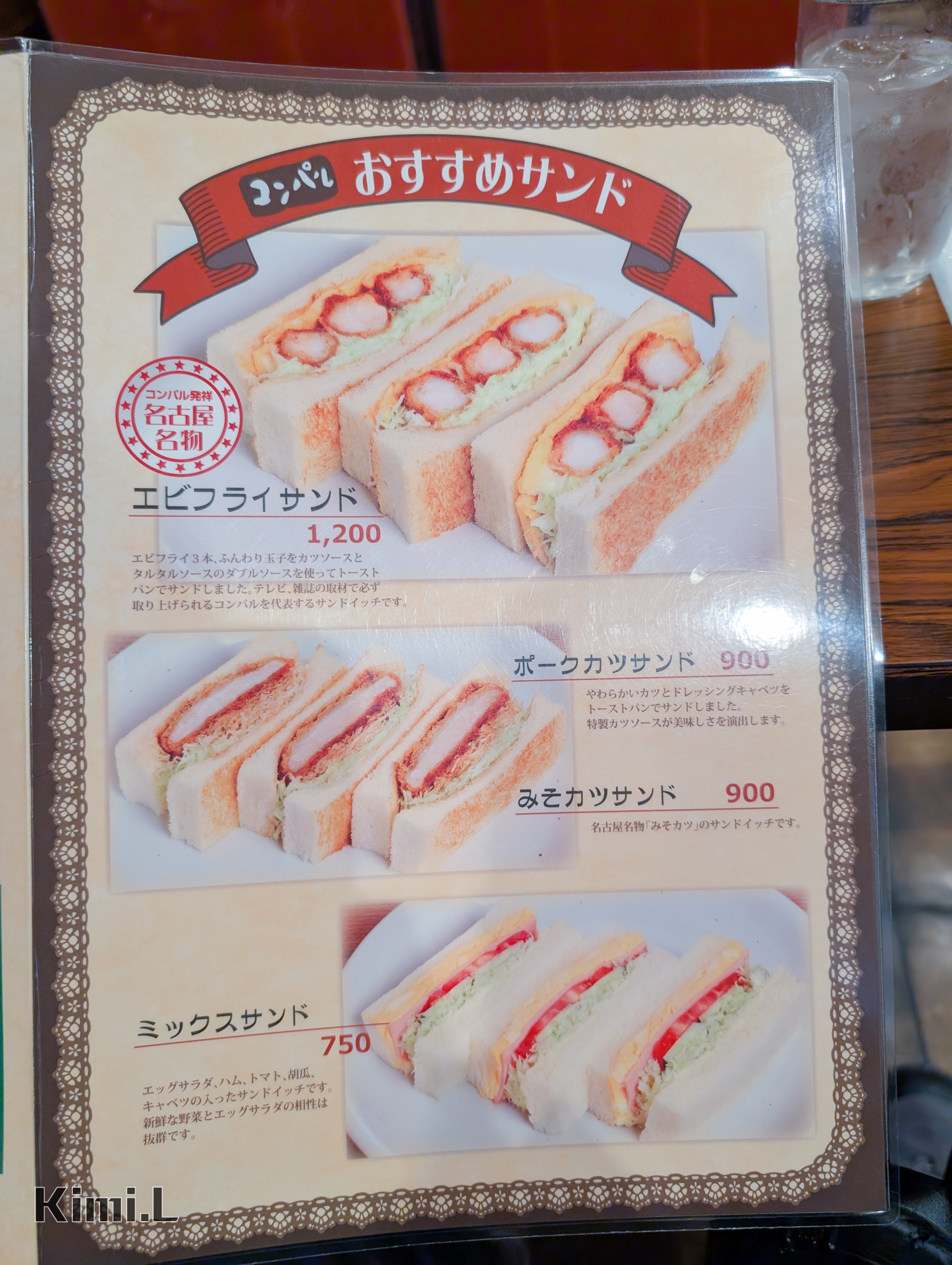 コンパル 是一間主要以販售三明治餐點而聞名的店家,除三明治系列外,還有吐司、甜點、飲品,名古屋的招牌 Moring Set 也一併提供。