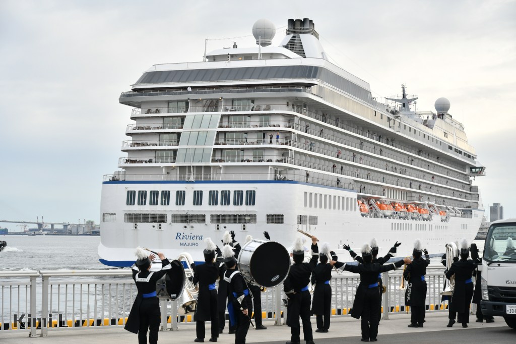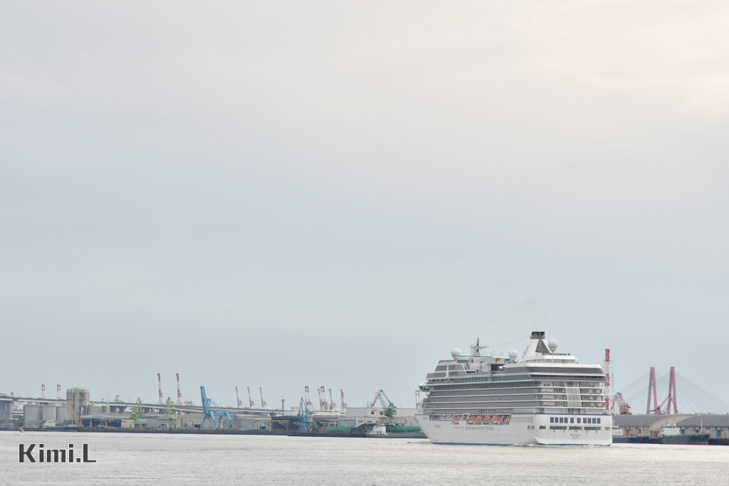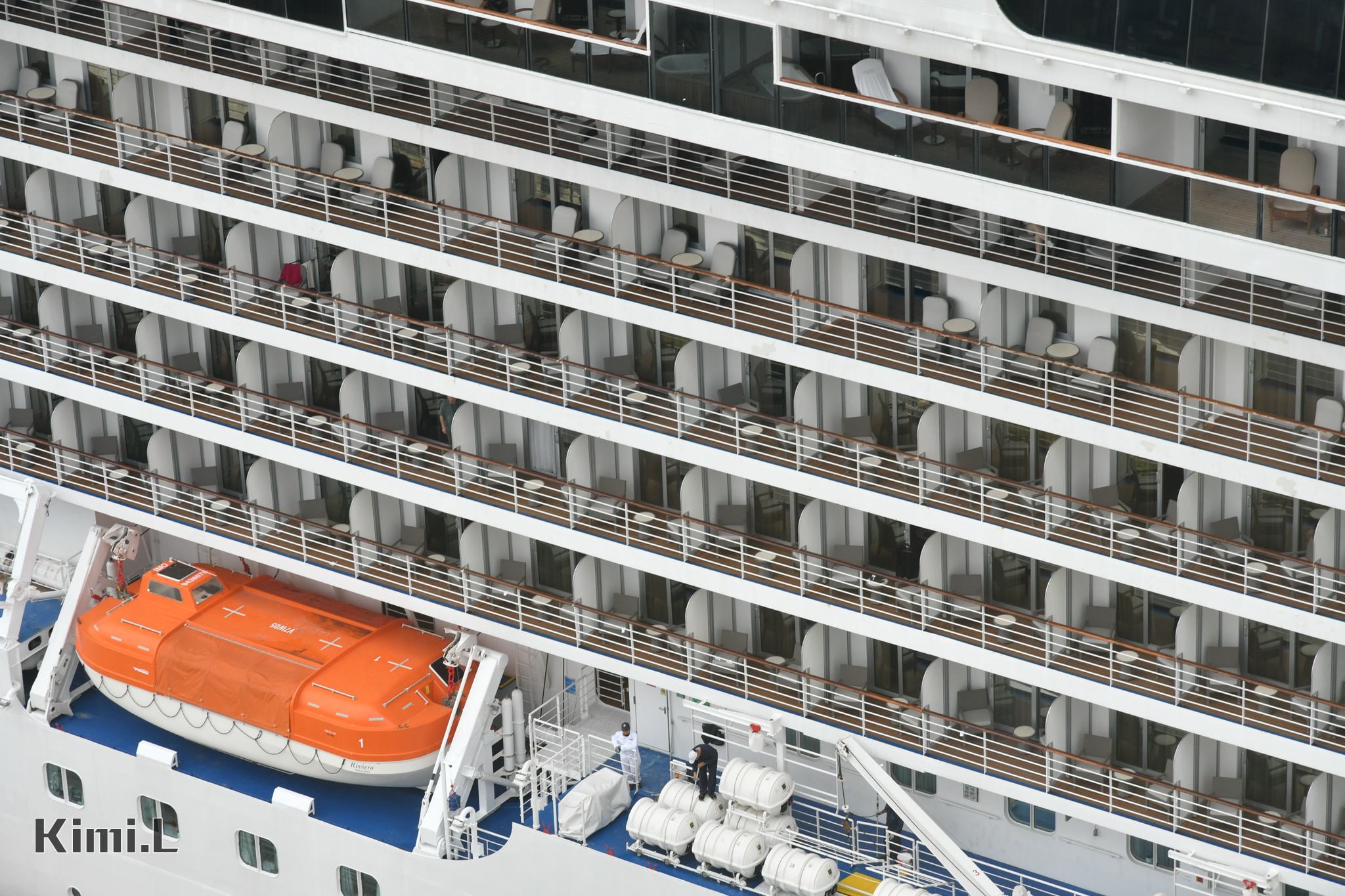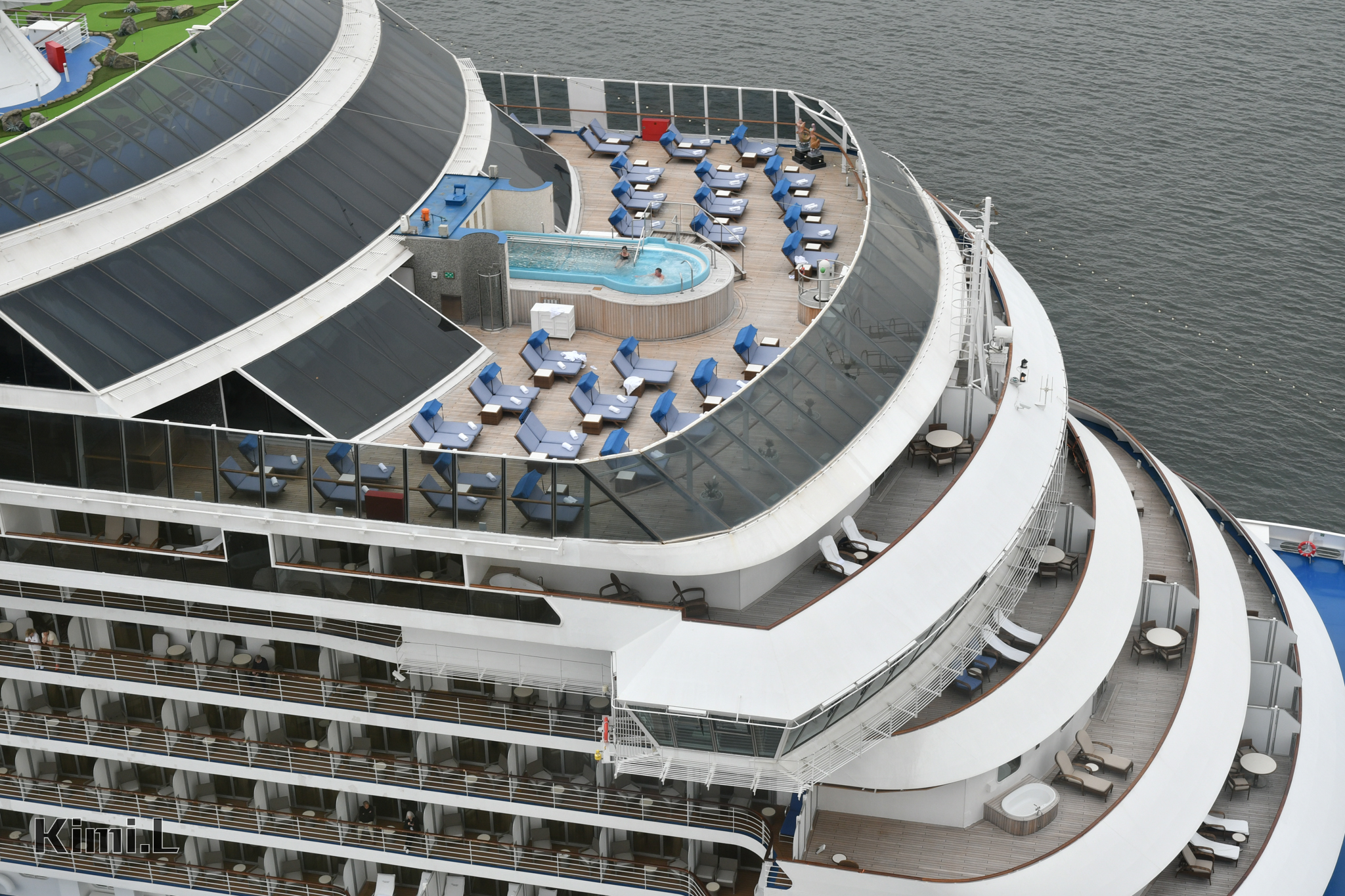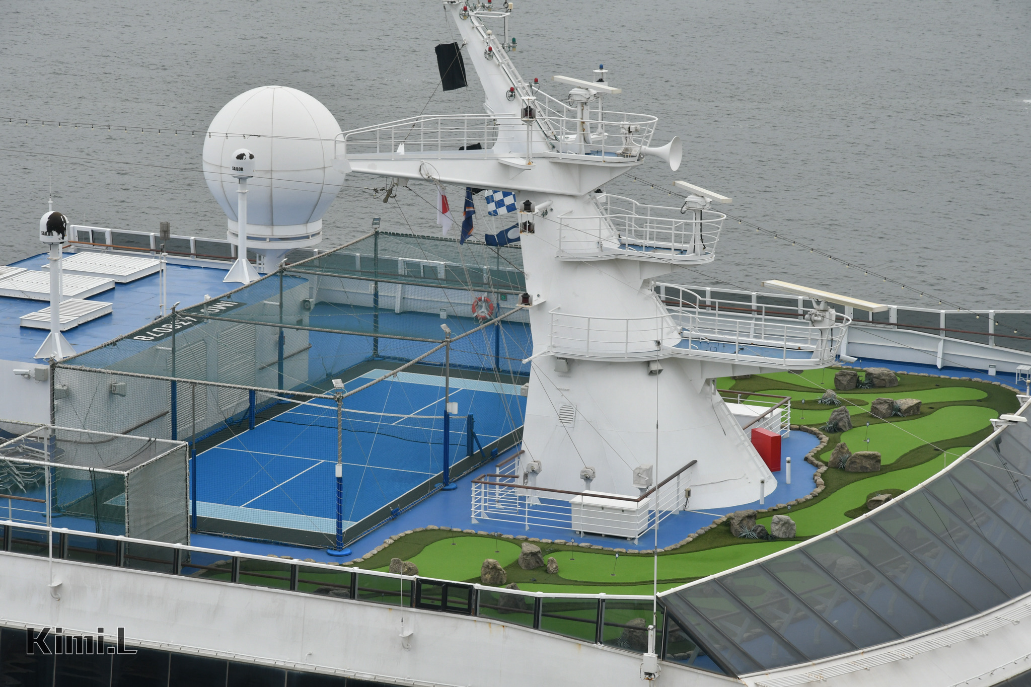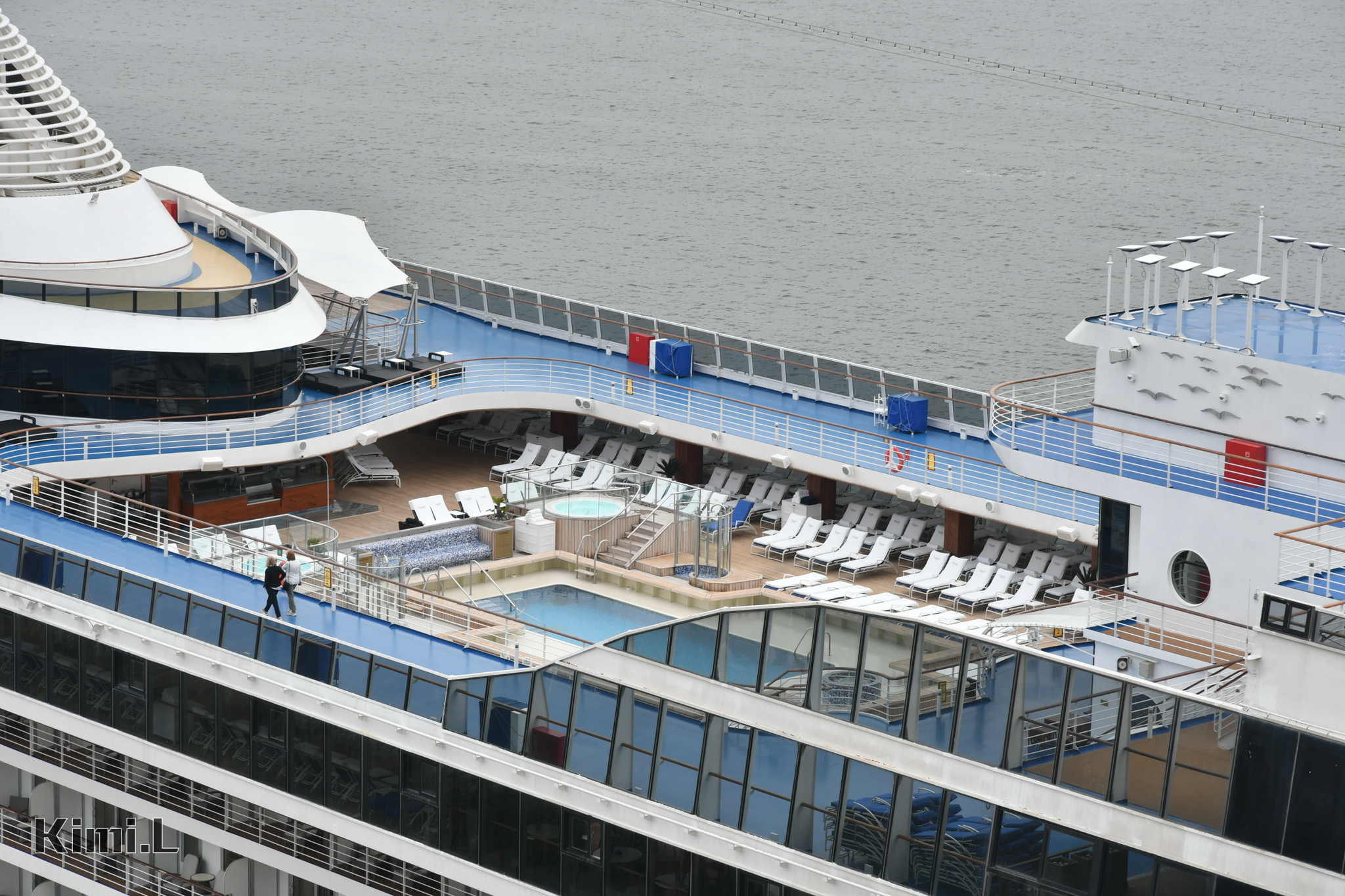 忙碌的在展望塔上看完四周風景後,我將注意力轉回港口邊停靠的大型郵輪 Riviera 號上,長達 200 多公尺的身軀很難讓人忽略,就連船上的泳池、網球、SPA 池…等設施也全都一覽無遺。
