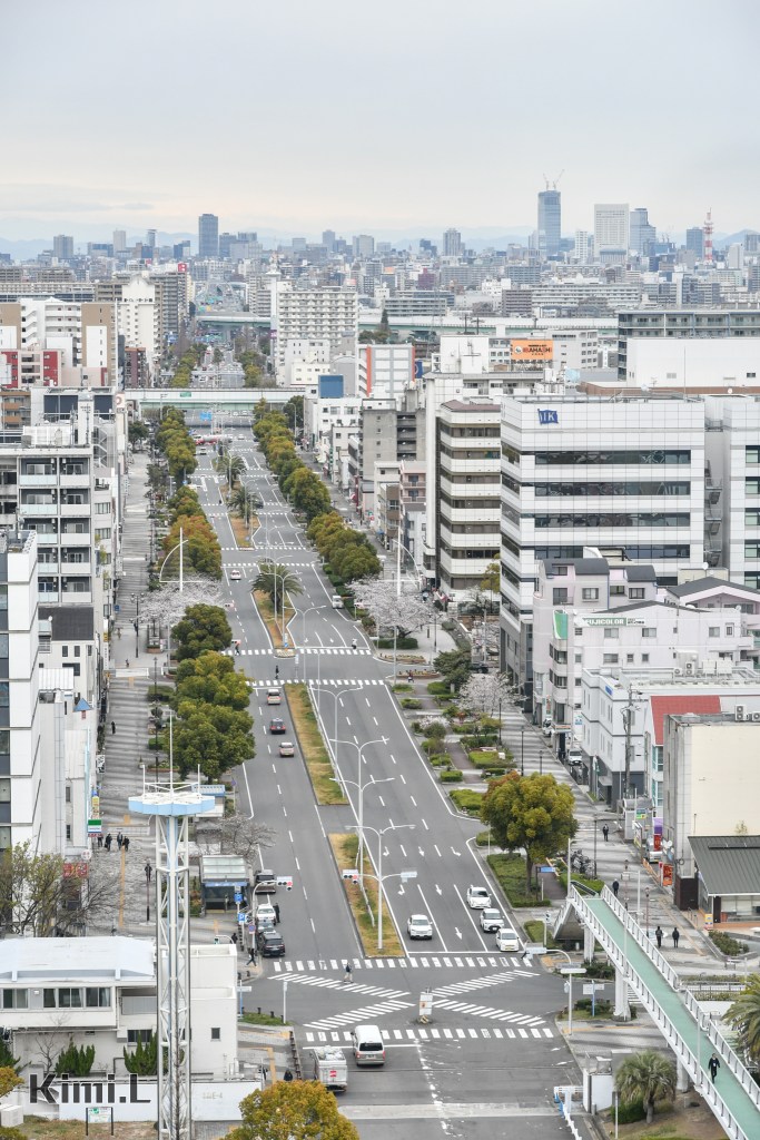 向北方望去能看見筆直的江川線,左右兩側綠意盎然的樹木伴隨著幾株盛開的櫻花樹,同時能看見相當完整的道路規劃,寬闊的人行空間與行車動線,實在是令人賞心悅目。
