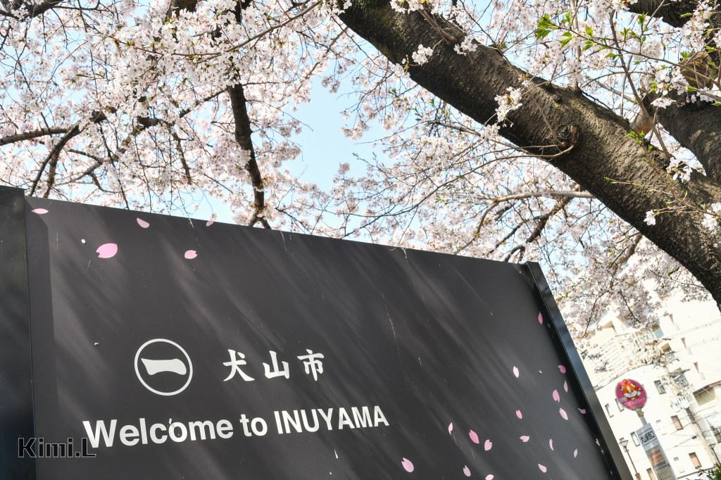 車站外的「歡迎來到犬山」告示牌上,印有櫻花飄落的圖案,與一旁盛開的櫻花樹相互輝映著,十分有意境。