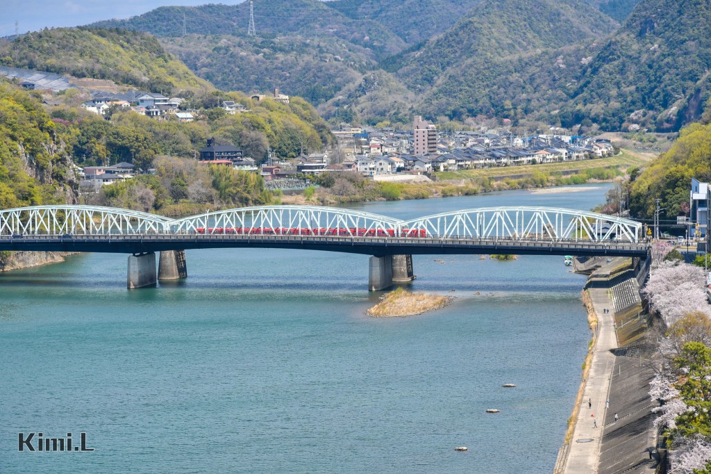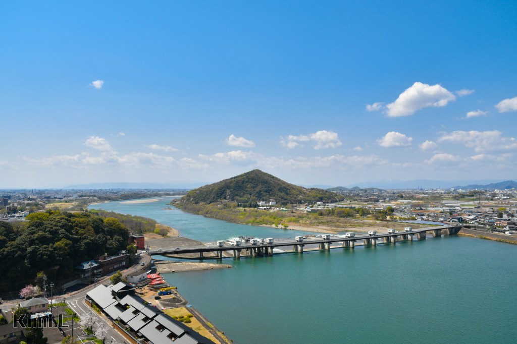 東側則可欣賞著名的犬山橋,最初設計是作為鐵路與公路共用橋梁,但隨著道路運輸的需求上升,後來在下游側興建了沒有鋼樑的橋體,作為公路運輸使用,橋面上通過的鮮紅色名鐵電車,與遠方的山脈和沿岸城鎮層層堆疊。