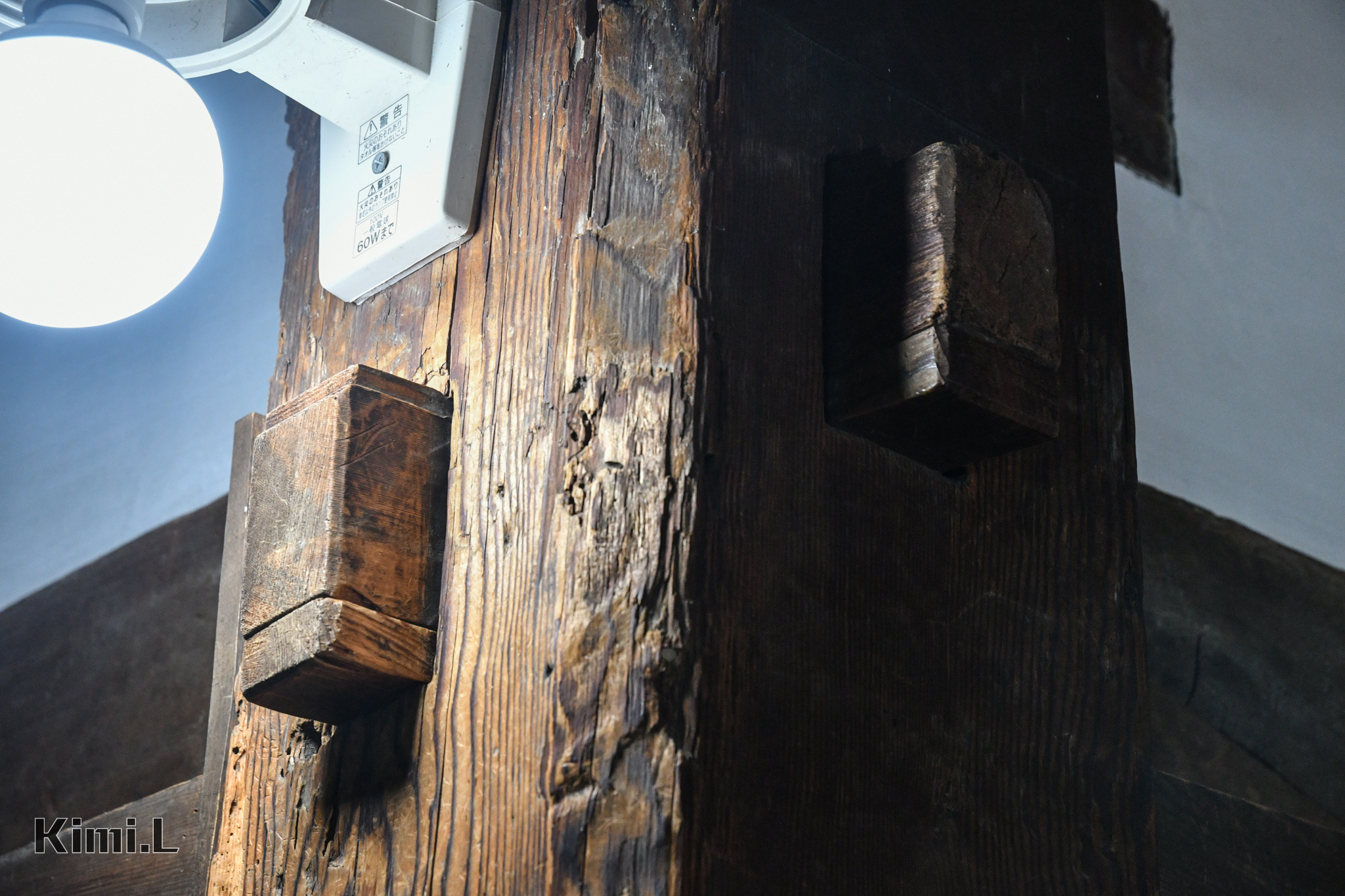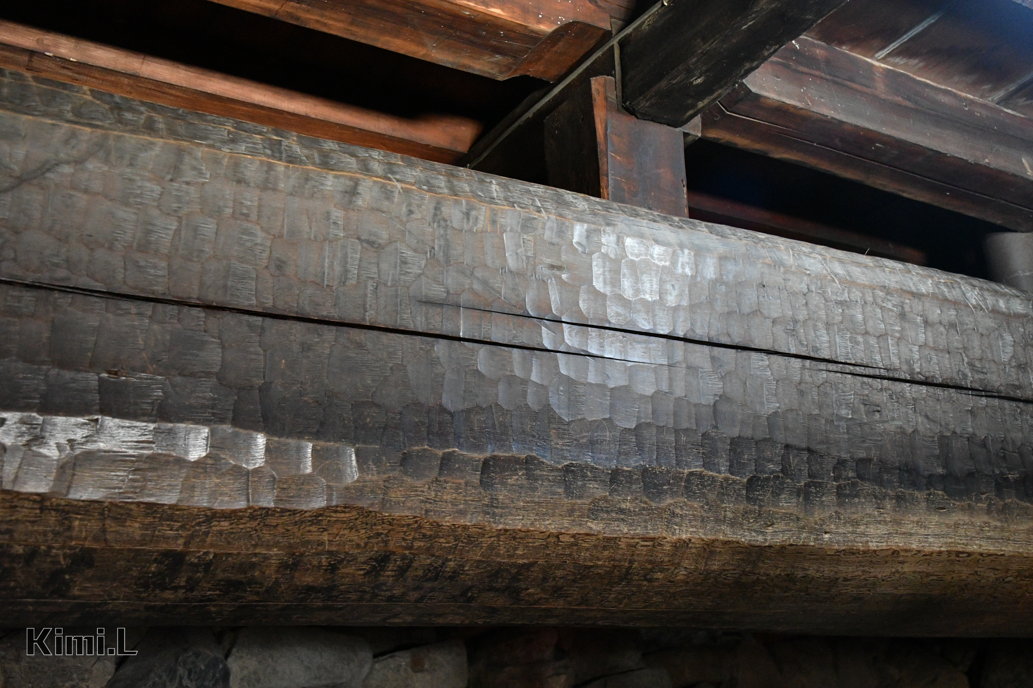最底部的地下一、二階為地窖,在這裡能看見石垣結構,整座天守閣便是以它為基礎向上建築而成,一旁還有相當粗壯的木造橫樑,上面能清晰看見工匠用手一刀一刀雕刻的痕跡,精湛的工藝讓人相當佩服。