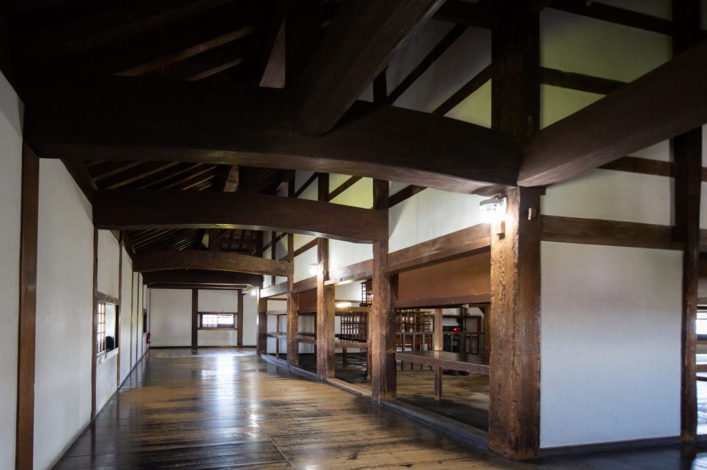 順著陡峭的階梯來到第一層,這裡是主要作戰的空間,走道一樣採用挑高的設計,並且在樓層的四個角落分別設置了「附櫓」與「落石窗」,武士們可以在城的內部透過這些機構,由內向外擊退入侵者,像是射箭、使用長槍向下攻擊試圖攀爬的敵人,或是朝下丟擲石塊等方式。