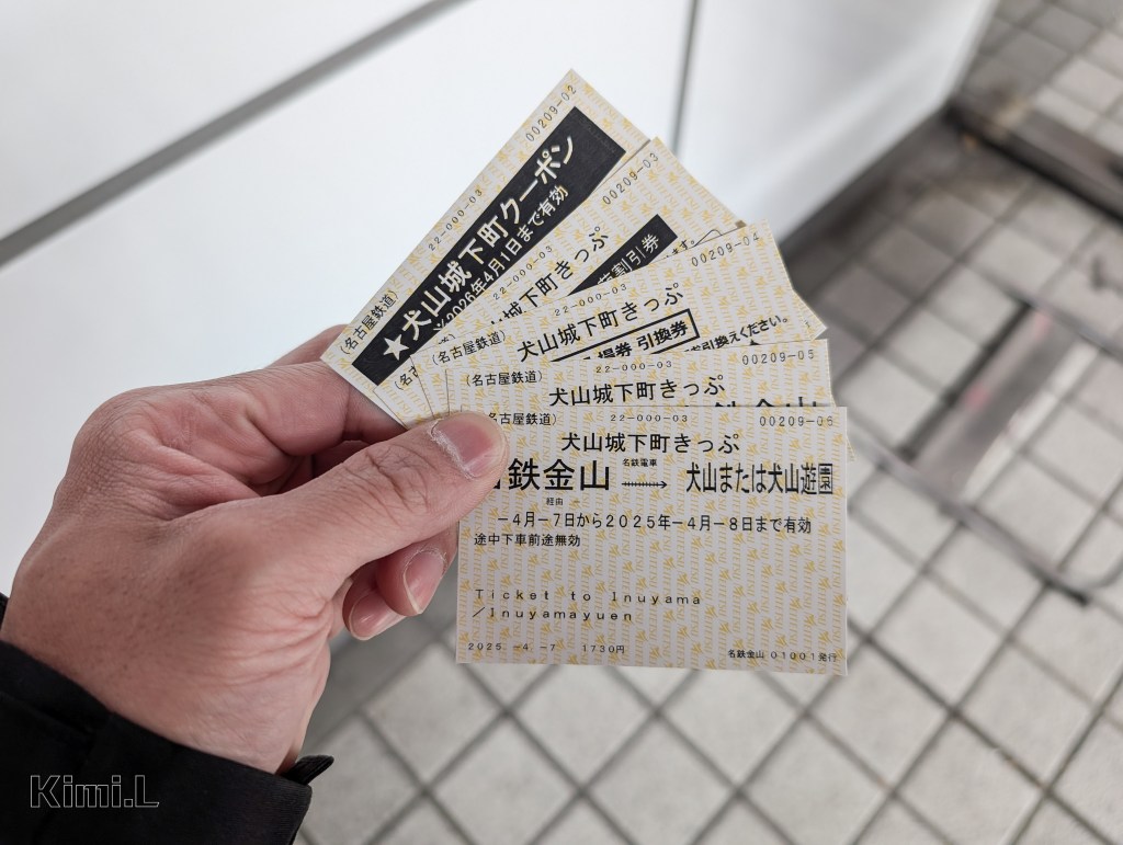 非自駕旅客要從名古屋市區前往犬山城,最便利的方式就是透過名古屋鐵道前往,可在車站的人工售票窗口購買「犬山城下町套票」,套票一共有五張票券,由上至下分別為犬山城下町優惠券(指定店家內享有折扣)、有樂苑入場優惠券、犬山城入場兌換券以及來回車票,以金山站出發為例,當時的售價為 1730 円。