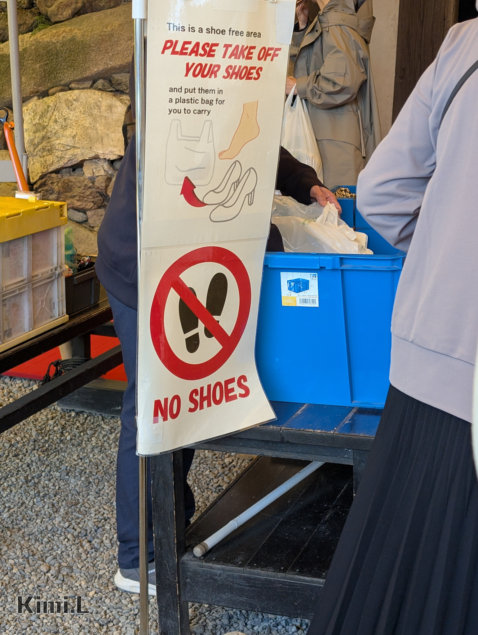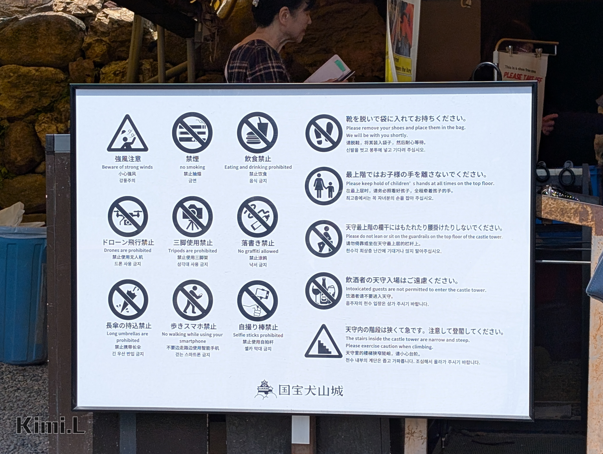 為了保護珍貴的天守閣,穿鞋入場是不被允許的,工作人員會提供裝鞋的塑膠袋,一旁也有入場的注意事項。