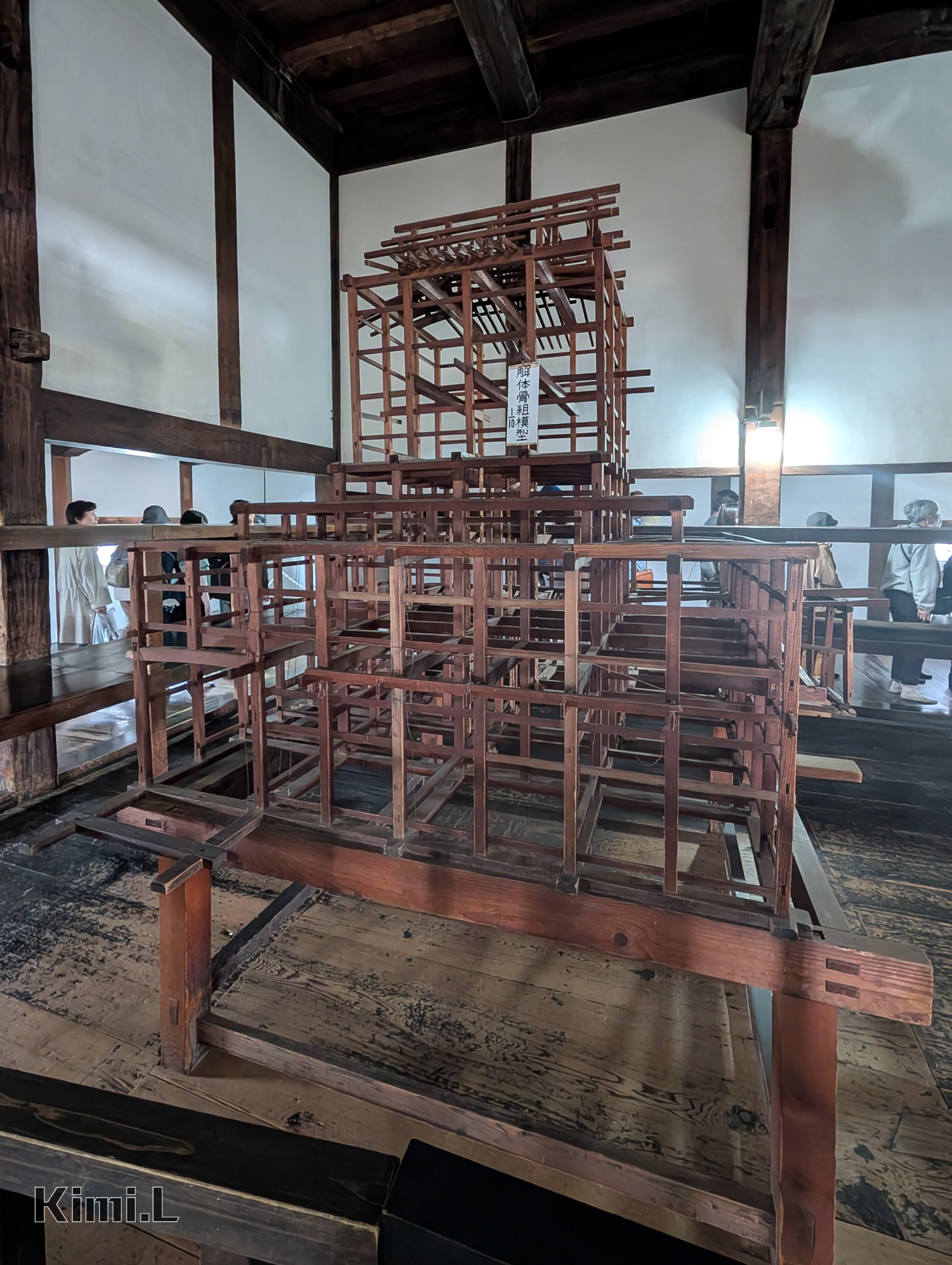 天守閣本體主要以木造結構所組成,工匠們會以大鋸將木材切割成適當長度,再使用榫接技術並搭配角釘來固定,透過天守閣的微縮模型,實在令人佩服 15 世紀就存在的精湛工藝。