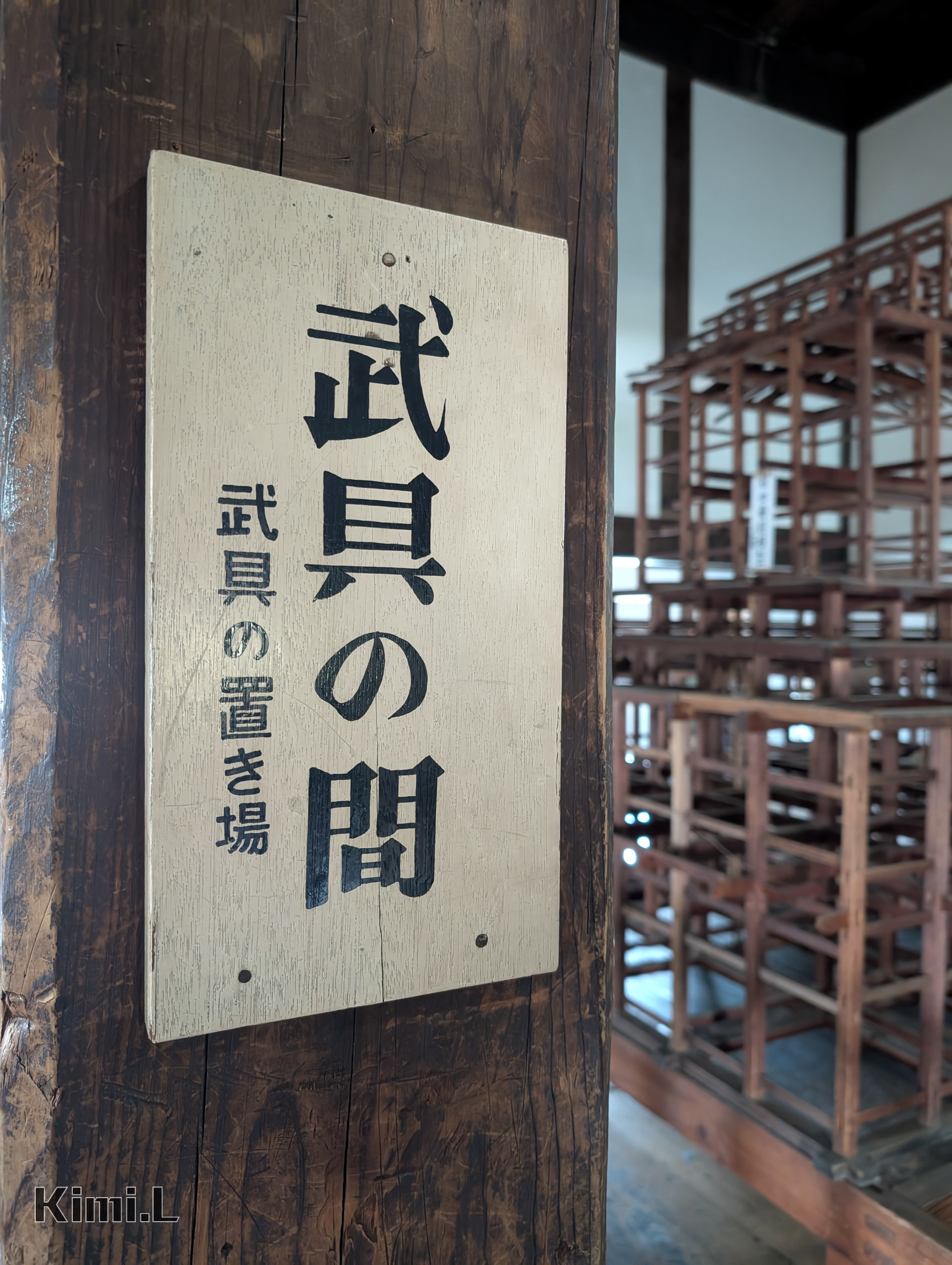 第二層則是武具之間與武士走道,此處為犬山城中最具有空間感的樓層,這是因為中央結構被拿來當作武具,像是武士們的鎧甲、武器的擺放處,再加上武士們穿起鎧甲後會需要較大的活動空間,才不會因為碰撞而自損戰力,在武具之間也能看到與犬山城一同被列為國寶五城的照片,都別具特色與不同的歷史價值,有機會一定要親自走一遭。