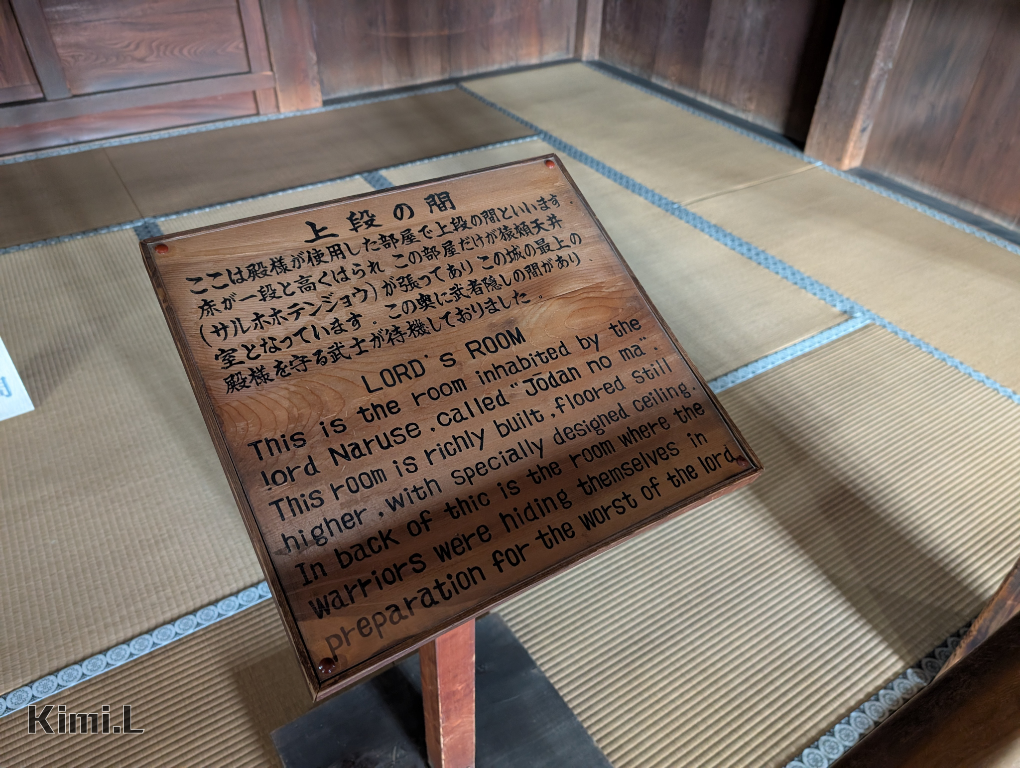 位於第一層中央的則是上段之間,是整個天守閣中唯一設有塌塌米的地方,地板處以刻意架高的方式顯彰顯他的地位,提供給身分高貴的人使用,後方的門則是被稱作武士隱,提供護衛藏身在內部以保護家主的安全。