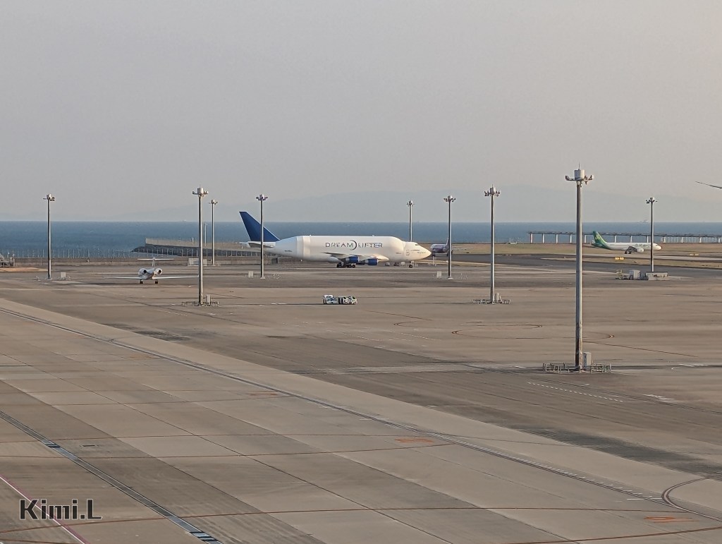 另一個能在中部國際機場看到的珍貴畫面,就是這架波音 747 LCF Dreamlifter,全世界僅有 4 架,它是基於波音 747-400 改裝而來的特殊貨機,改裝工程正是由長榮航太在台灣所進行的,主要被拿來運送波音 787 客機的機組件,如機身或機翼,而部分機身與機翼正是由日本三菱重工、SUBARU、川崎重工所製造,接著使用船運將這些組件運至中部國際機場,最後再使用 747 LCF Dreamlifter 運輸至美國。
