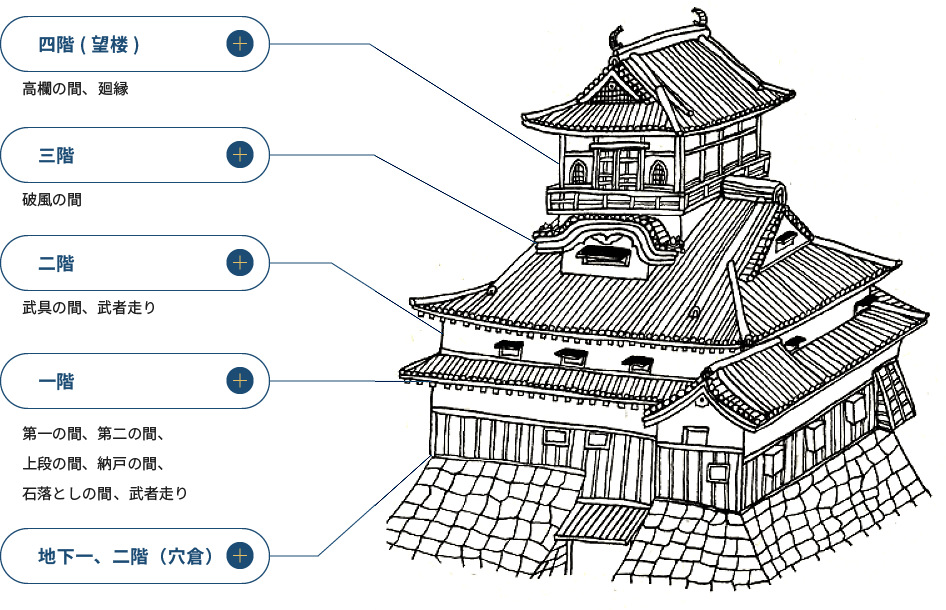 犬山城天守閣為望樓型構造,在底層的大屋頂上建造一座較小的瞭望塔,從外觀上來看只有三層,但實際上內部包含四層與地下兩層(望樓型三重四階地下二階)。