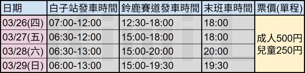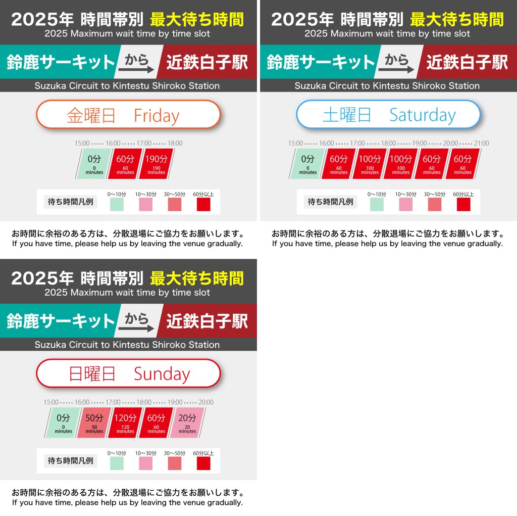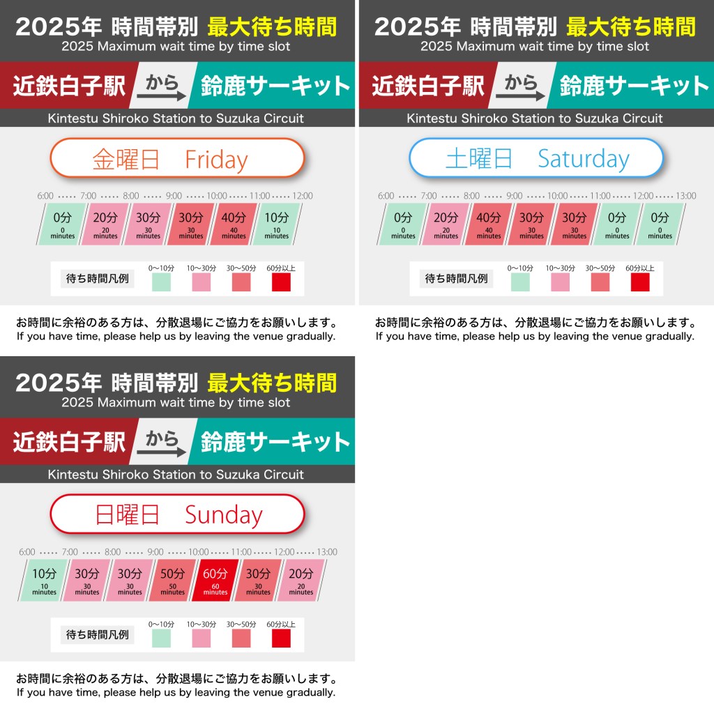 本次賽事和往年一樣,三重交通有提供鈴鹿賽道往返白子站的接駁巴士,利用近鐵自名古屋搭乘至白子站的朋友,可多加利用,另外官方有整理去年賽事周,接駁車在各日各時段的最大等候時間,請各位自行評估交通時間。
