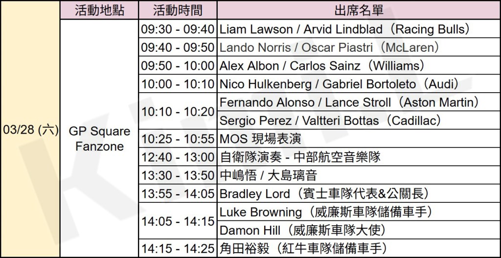 該活動為 F1 賽事前的傳統,所有車手們將搭乘車輛進行繞圈,兩位 Aston Martin 的車手將預計在 C 席(本田應援席)前和觀眾們打招呼。