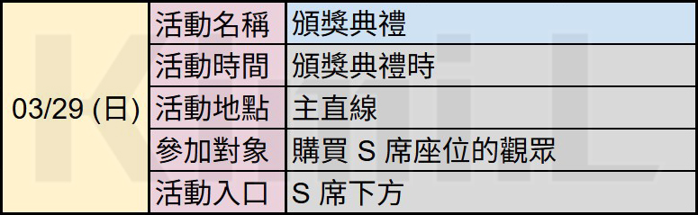 在 16:15 後,請依照號碼牌分組 Gr.1 – Gr.10 對應之入場時間就座,整理券申請期間自 03/21 (六) 11:00 至 03/27 (五) 23:59 止,每次申請最多能取得兩張整理券。