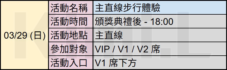 在排位賽結束後,V1 與 V2 席將成為自由席,觀眾可在這兩個座席區域自由選擇喜愛的位置,16:15 後未就座的空席將被釋出。