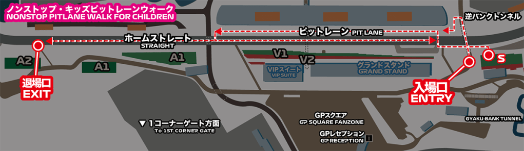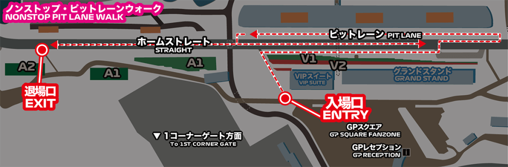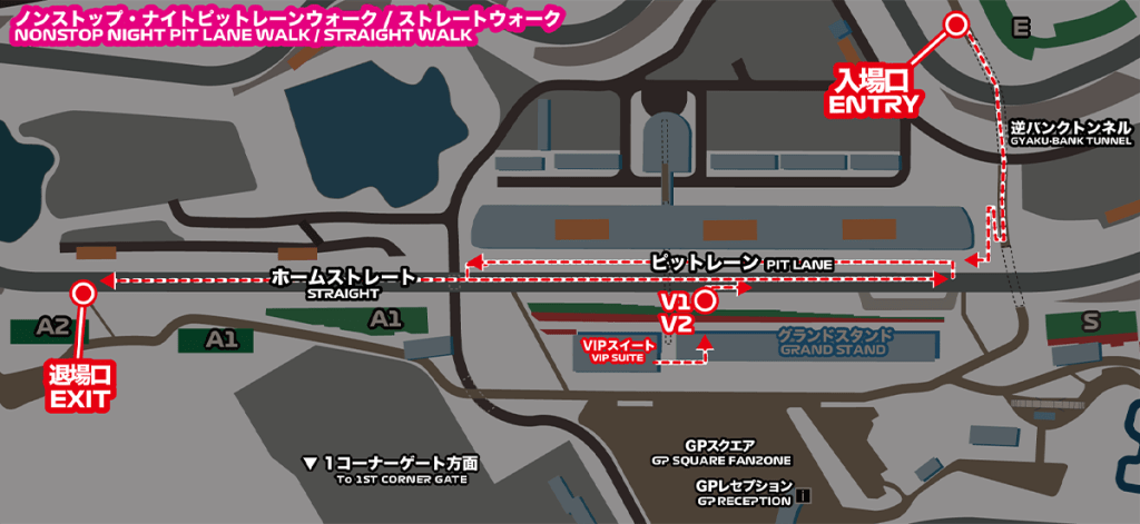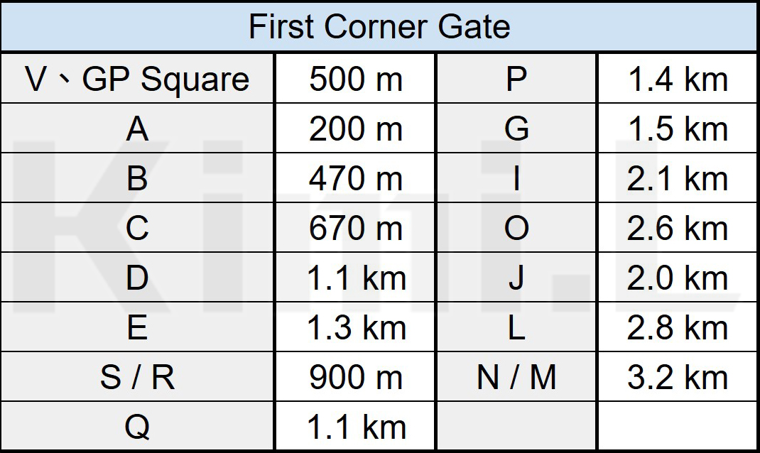 Main Gate 與 First Corner Gate 為鈴鹿賽道主要的出入口,Main Gate 適合搭乘往返賽道與白子站接駁車的觀眾(下車地點為 P9 停車場),以及預約直達巴士的觀眾(下車地點為 P7 停車場),下車後步行約 10 分鐘即可抵達,First Corner Gate 則適合搭乘電車至鈴鹿賽道稻生站的觀眾,自車站至此入口步行時間約 20 分鐘,入口距離 V、B、C 等三席距離較近。