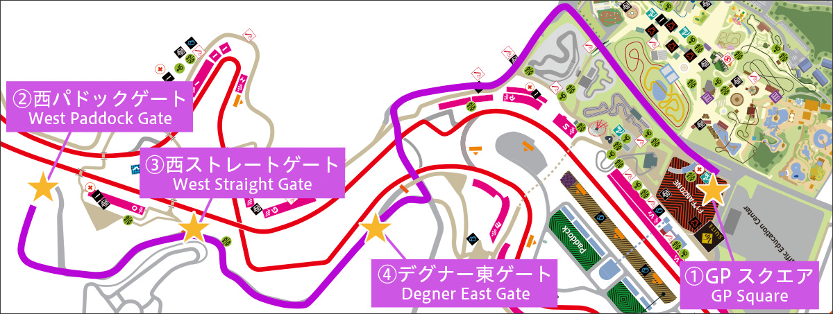 由於西區座席較為偏遠,鈴鹿賽道在 GP Square 的位置設有場內接駁車,乘車地點以及各站下車順序請參考圖片。
